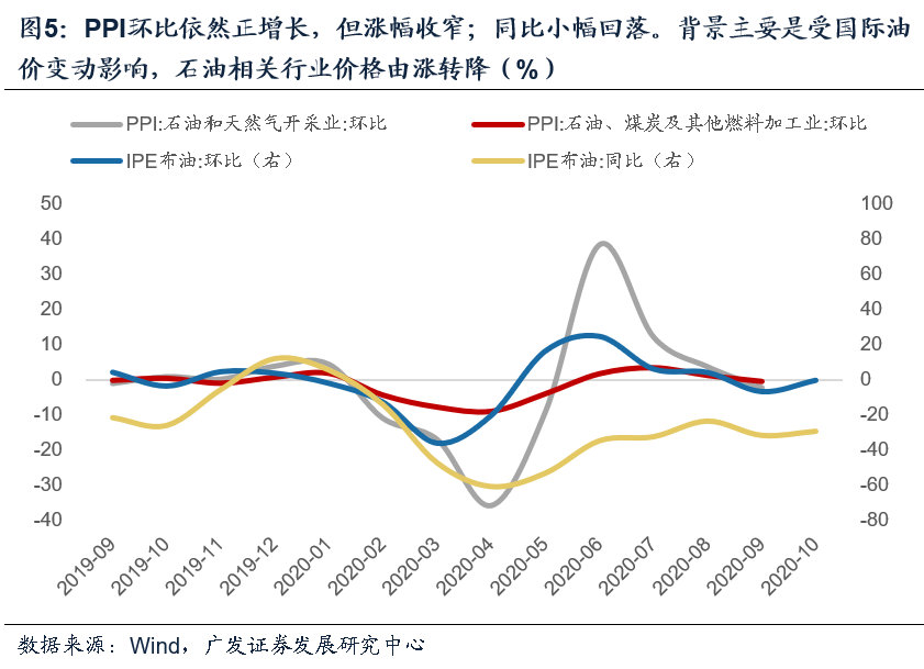 10月原油价格已初步企稳,IPE布油价格同比从-31.7%收窄至-29.4%,对PPI短期拖累消失。往未来看: