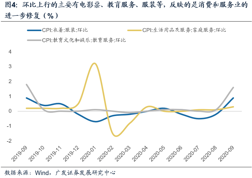 从统计局数据看,9月电影票价格上涨4.1%;教育服务价格上涨1.6%;服装价格上涨0.9%。这些价格变化反映的是消费和服务业的进一步修复。