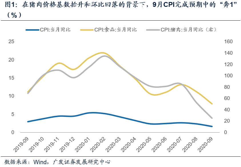 在猪肉价格基数抬升和环比回落的背景下,9月CPI完成预期中的“奔1”。