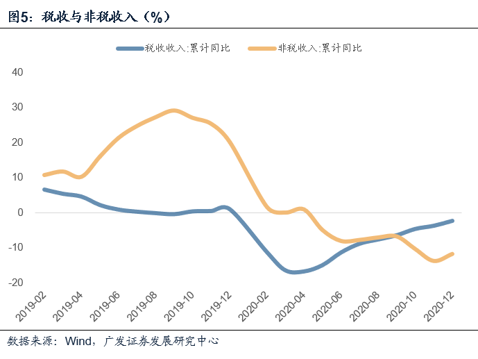 2020年公共财政收入同比下降3.9%,其中税收收入拉低1.9个点,非税收入拉低2个点。从年内走势看,四个季度的税收收入增速分别为-14.3%、-6.0%、6.8%、14.2%,主要税种增幅均逐步回升,微观上映射同期宏观经济的逐步好转。个税同比增长达11.4%,部分源于2019年个税减免政策导致的低基数效应;土地与地产相关税种全年增速偏高,拉高财政收入0.5个点。2020年全国税收收入15.4万亿元,同比录得-2.3%,拉低全年公共财政收入1.9个点;分季度来看,2020年四季度的税收收入同比增速分别为-14.3%、-6.0%、6.8%、14.2%,全年税收收入降幅呈逐步收窄态势,这与经济稳定恢复、工业增加值、企业利润、进出口等主要经济指标逐步回升有关。分结构来看,主要税种中的国内增值税同比-8.9%,拉低财政收入2.9个点,其累计降幅连续8个月收窄,10、11、12月当月分别增长9.1%、8.1%、7.7%,基本恢复正常。企业所得税同比-2.4%,拉低财政收入0.5个点,其中下半年随企业利润恢复性增长,降幅在逐步收窄。个税同比增长达11.4%,拉高财政收入0.6个点,主要是居民收入随经济复苏恢复性增长以及股权转让等财产性收入增加,叠加2019年个税减免政策导致的低基数效应。国内消费税同比-4.3%,拉低财政收入0.3个点,其累计降幅于二、三季度逐月收窄,四季度基本保持稳定。对外贸易方面,进口货物增值税、消费税同比-8.1%,拉低财政收入0.7个点,其降幅随着一般贸易进口增幅回升而逐步收窄。2020年全年办理出口退税14549亿元(包括动用以前年度结转资金安排的920亿元),有力促进外贸出口稳定增长,但相较进口方面,外贸企业出口退税增幅较2019年下滑较多。受土地出让和房地产销售增势较好影响,土地与地产相关税种对2020年全年财政收入贡献为正,其中土地增值税、契税分别增长0.1%、13.7%,共计拉高财政收入0.5个点。![]()