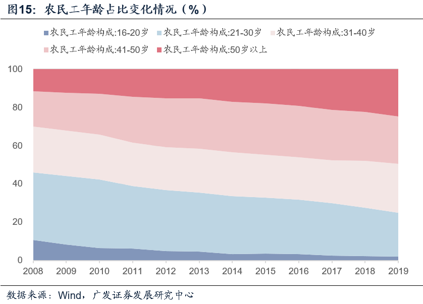 我国农民工“老龄化”趋势也较为明显,近七年来农民工平均年龄逐年提高,自2013年的35.5岁上升至2019年的40.8岁。其中,50岁以上的农民工人数占比自2008年以来持续提高,由2008年的11%这一比重提升13个百分点至2019年的25%,而2019年40岁以上的农民工占比已近50%;与之对应地,16-30岁这些新生代农民工占比则出现逐年下降的趋势,由2008年的46%下行21个百分点至2019年的25%。