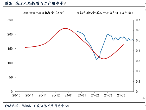 从2021年的月度数据看,第二产业用电量与南方八省日均耗煤大体一致。