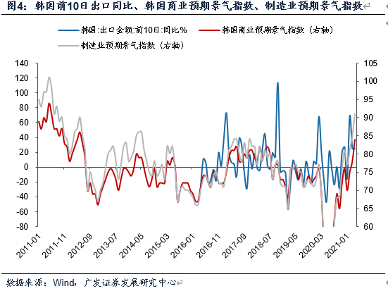 另一方面:4月上旬韩国、越南出口延续双位数高增。4月前20日韩国出口同比增速录得历史新高的45.4%(3月和3月前20日数据分别为16.5%、12.4%),相较19年近两年加权平均增速为2.1%(前值10.1%);值得注意的是4月韩国商业预期景气指数、制造业预期景气指数录得84、91,同比增速录得2011年以来新高的58.5%、68.5%。