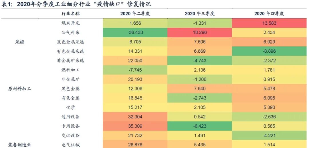 我们以“疫情缺口”的季度环比变化观测行业修复的斜率,发现2020年各季度经济修复主线经历了非常明显的结构转换:2020年上半年经济修复的重点集中在建筑产业链、汽车产业链、食品制造、中游装备制造和工业品制造等领域;2020年三季度开始,中游行业修复开始放缓,上游采掘、原材料加工,下游服装产业链修复开始加快。