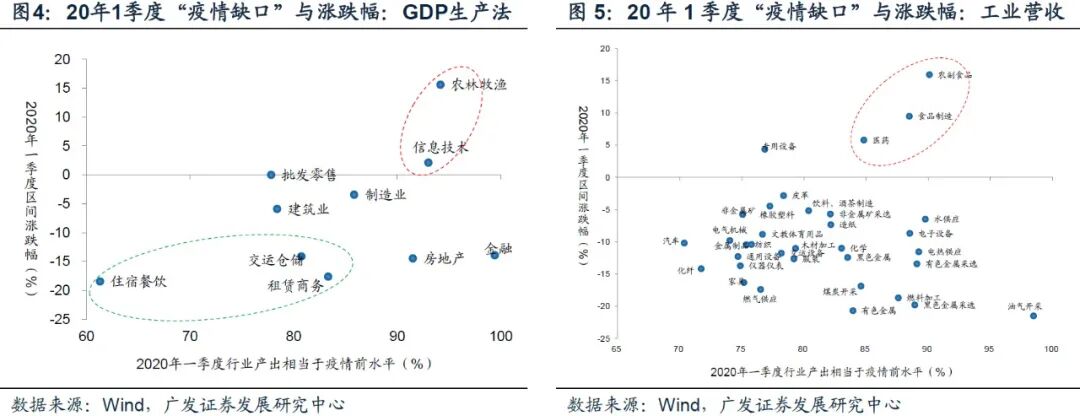 一季度各行业涨跌表现部分反映了与“疫情缺口”的行业差异。受疫情冲击最显著的服务业,以及受疫情影响较小的农林牧渔、食品、信息技术行业,分别在资产定价上得到了不同的反馈,但除了上述行业以外,各行业涨跌幅与其“疫情缺口”并不存在关联。