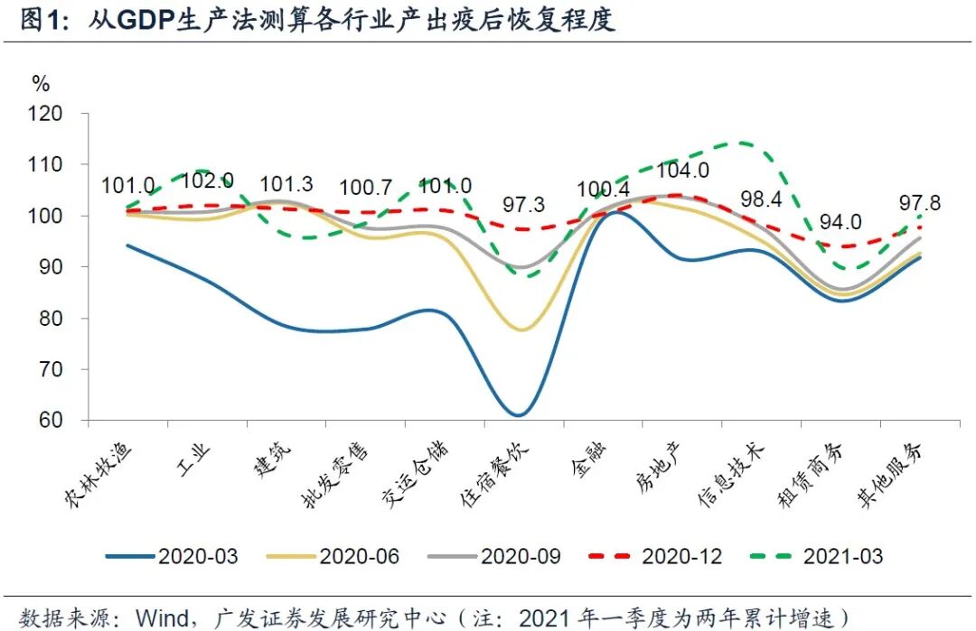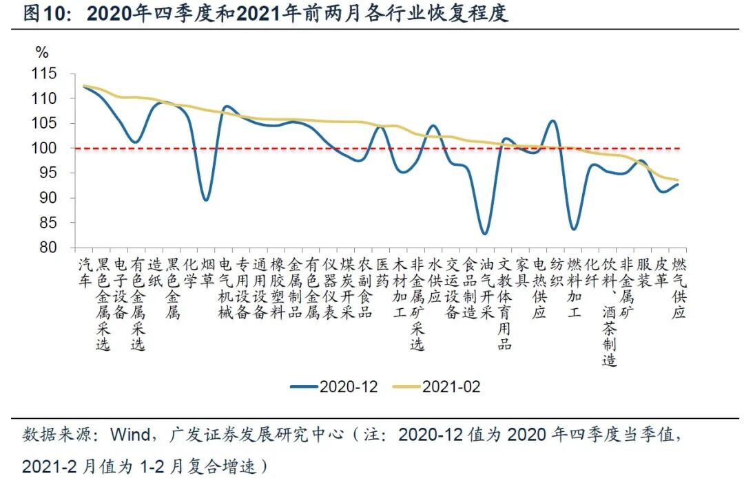 第二,截至2020年末,以GDP生产法核算的分行业增加值来看,住宿餐饮、信息技术、租赁商务、其他服务业共四大行业尚存在“疫情缺口”。以工业细分行业来看,尚未恢复到疫情前100%水平的行业主要集中在上游采掘和原材料加工、下游消费品制造和公用事业。