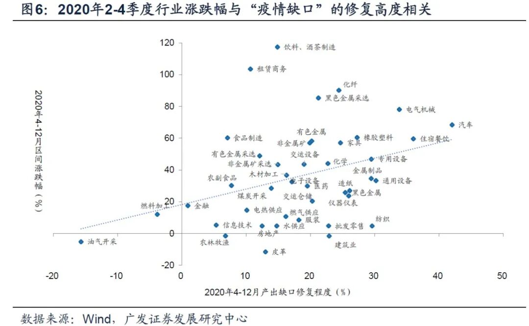 从去年后三季度各行业涨跌幅与“疫情缺口”的修复程度来看,可以发现: