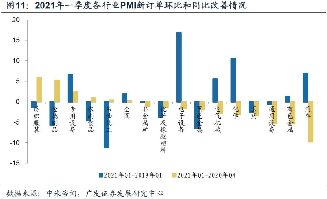 工业细分行业方面,结合PMI新订单判断各行业短期内修复情况,2021年一季度景气度环比改善的行业包括纺织服装、金属制品、专用设备、农副食品加工和石油化工。