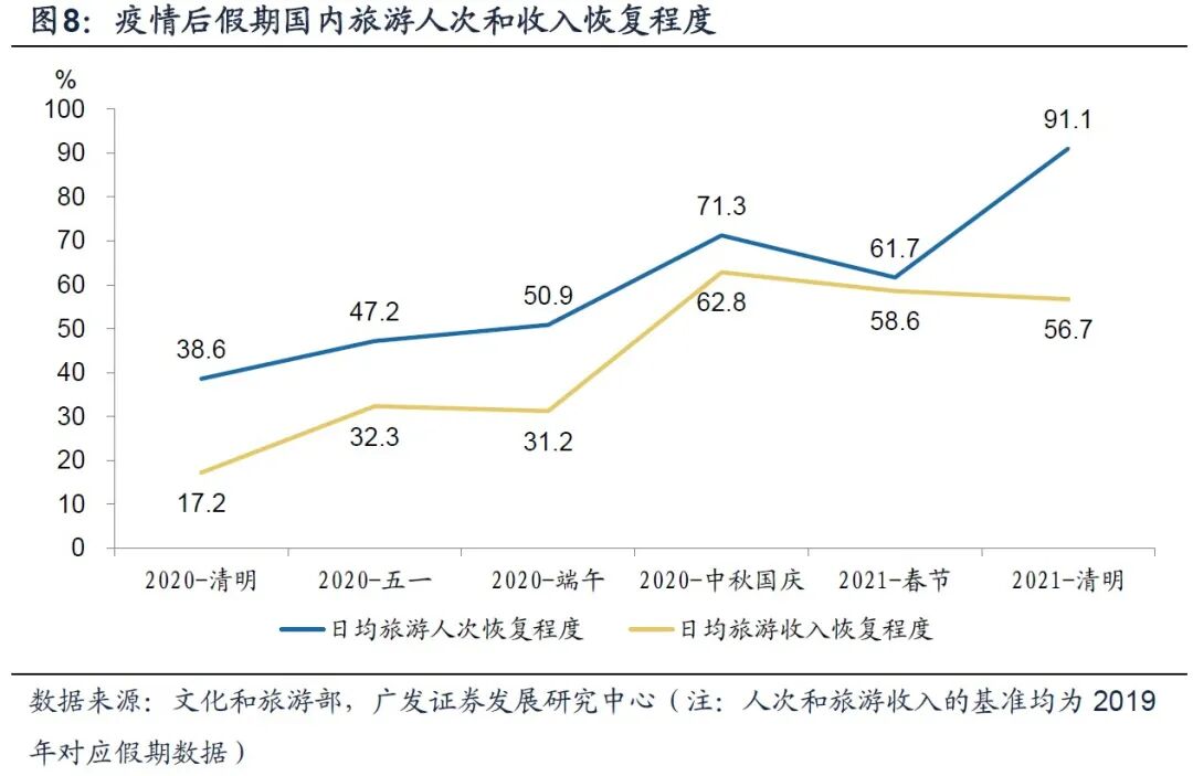 冬季国内疫情反复和“就地过年”延缓了服务业的修复进程,二季度开始服务业“疫情缺口”的快速修复有望重启。从环比分析法入手,今年一季度服务业环比增长显著弱于季节性(2017-2019年平均水平),尤其是住宿餐饮、租赁和商务服务、其他服务业和批发零售。从宏观层面解释,2020年冬季国内疫情的反复以及“就地过年”的推行,阶段性减缓和延后了去年二季度以来的服务业快速修复进程,这在国内旅游人次和旅游收入的修复进度上可以窥见一二。而清明假期旅游数据恢复明显加快,日均旅游人次已经恢复至疫情前的91%,服务业“疫情缺口”的修复进程有望重新提速。