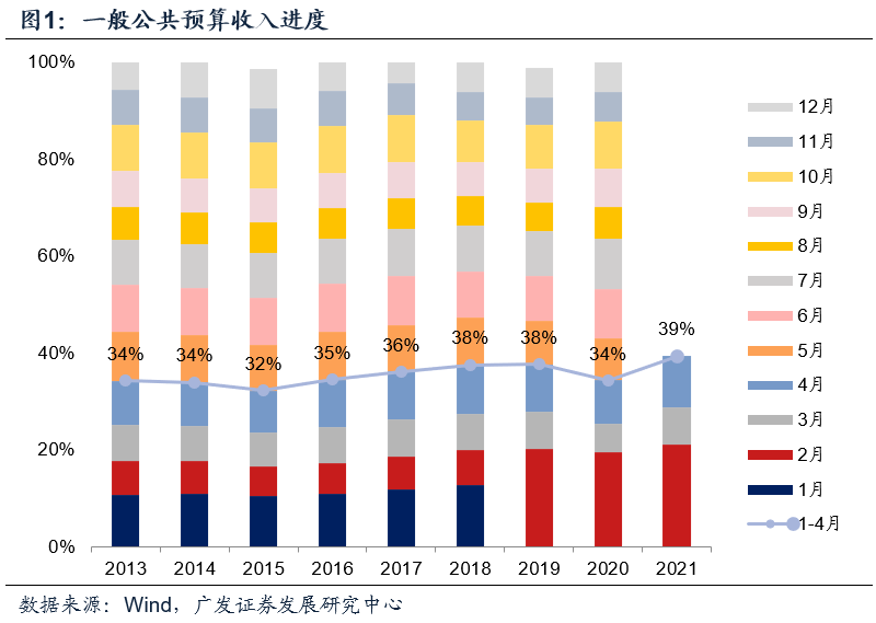 收入进度数据也反映了同样的信息,1-4月一般公共预算收入进度达39.5%,较2018-2019年加快约1.7个百分点,其中一季度贡献约1个点,四月贡献约0.7个点。同时需要注意的是,由于今年收入目标设定得较为谨慎,同时存在价格方面的不确定因素,故全年超收概率较大,在谈及收入进度偏快的时候需要将这些因素纳入考量范畴。