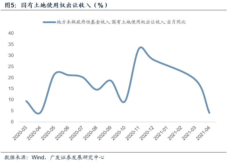 4月的政府性基金收入增速回落幅度较大,同比由前期的23.1%回落至9.2%,其中的国有土地出让收入由前期的19.1%回落至4.1%。一则可能是去年土地收入的递延效应开始放缓,二则同期土地市场也确呈一定幅度的降温。4月政府基金性支出端增速则在新增专项债恢复发行的带动下开始回升,这一回升趋势预计将延续至未来数月。