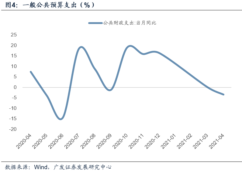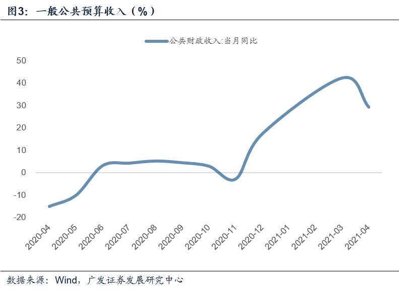 4月,一般公共预算收入同比29.4%,较前期的42.4%明显回落。但这一回落趋势主要受去年基数影响,故对比2019年可知4月公共财政收入两年年均复合增长率为4.9%,较3月的2.6%有所回升。在一季度的平稳低增基础上略有回温。