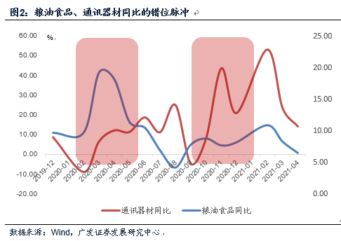 我们再以可选消费品的通讯器材为例,由于疫情带来的渠道约束(消费者一般还是会先到实体店看手机),它在2020年一季度同比增速只有-3.6%,2020年4-8月、11-12月经历了两轮上行脉冲,这个会带来2021年基数分布的影响。