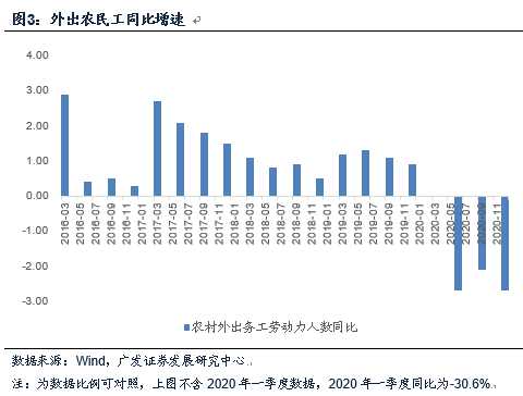 外出务工减少所带来的收入效应下降可能是主要背景之一。2020年四个季度外出务工劳动力同比增速分别为-30.6%、-2.7%、-2.1%、-2.7%;月均收入同比分别为-7.9%、-6.7%、2.1%、2.8%。