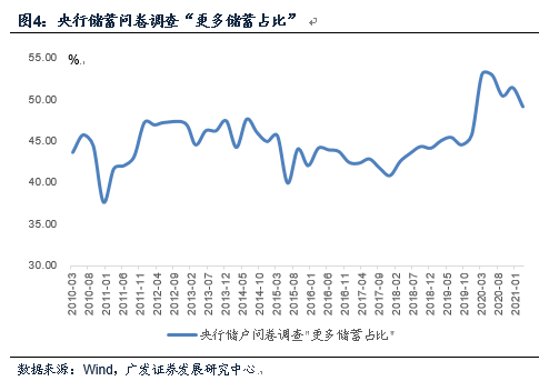央行城镇储户问卷调查“更多储蓄占比”项2019年四季度月为45.7%,2020年一季度跳至53.0%,二季度为52.9%,三季度、四季度分别为50.4%、51.4%。2021年一季度进一步下降为49.1%,但这一水平较疫情前仍有距离。