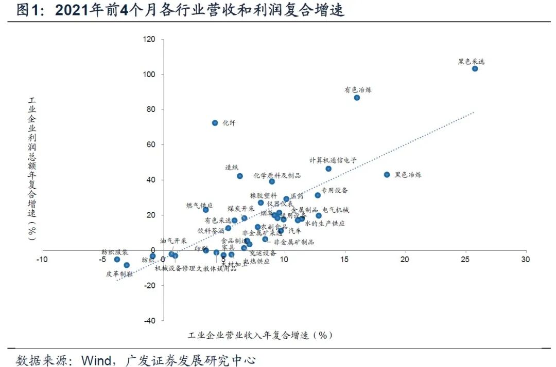 进一步细化行业利润情况,利润绝对增速靠前的行业主要包括,化纤(650.2%)、有色冶炼(484%)、黑色冶炼(416.1%)、化学原料及制品(272%)、黑色采选(194.4%)、机械设备修理(181.8%)、汽车(157.5%)、油气开采(119.4%)、水的生产供应(101.2%)、有色采选(100.6%)、煤炭开采(91.5%)、造纸(91.5%)。