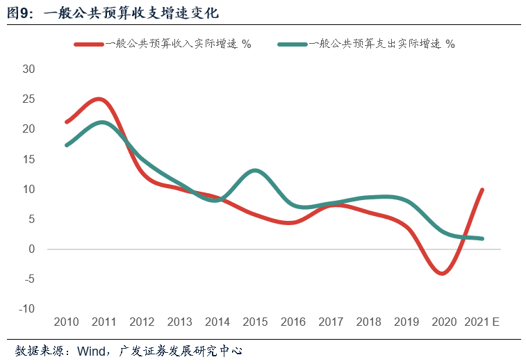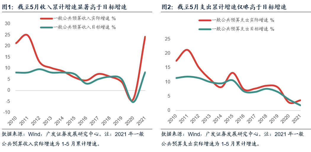 受疫情影响,2020年财政政策大规模扩张,积极财政更加积极。因此,去年末至今年初的市场普遍对2021年财政政策抱有环比收缩的预期,几项关键指标如财政支出、地方债规模、赤字率等的预期均较为一致。然而,后续会议披露的目标赤字率3.2%、新增专项债额度36500亿元等信息都略超此前预期,沿预期上限收敛。中长期来看,尽管财政政策的收敛回归是一种既定趋势,但并不急于在今年内迅速修复。做好过渡、防范政策快速收敛带来的风险、让财政政策更有持续性是今年的政策主题。(二)控杠杆、化风险、促改革:财政纪律收束也是重要的政策主题去年12月中央经济工作会议新增表述“抓实化解地方政府隐性债务风险工作”,3月国常会提出“保持宏观杠杆率基本稳定,政府杠杆率要有所降低”,今年财政部也多次提出对隐性债务监管、加强对专项债全生命周期穿透式监管。2021年作为“十四五”开局年,同时也是经济增长稳定、财政收入扩张的年份,是政策端推进各项改革举措的良好时机。4月中共中央政治局会议也明确提出,今年以来“经济运行开局良好”,不需要特别稳增长,并进一步提出“要用好稳增长压力较小的窗口期”,适度推进调结构。因此,控杠杆、化风险、促改革也是今年政策的重要主题之一。综合来看,今年的政策主旨是一边“开正门”,通过较大规模的预算内支出做好今年的财政过渡工作,保障基本的经济增长,一边“堵偏门”,抓住良好时机推进各方面现存问题的解决与调整。(三)上半年财政发力受限,对市场与经济产生深远影响尽管今年整体政策基调仍是积极的,但开年以来在政策监管影响下,地方债发行节奏明显偏慢,间接拖累了第一、二本账的财政支出进度。财政发力低于预期导致了开年以来的基建增长较为乏力、债市流动性相对宽松等现象。最终形成了2021年财政节奏后置的重要特征,财政错位特征将对今年的经济与市场产生深远影响。那么,市场普遍认为的今年财政节奏偏慢是真的吗?我们在下文中将对1-5月的财政收支情况进行梳理,并在回顾过程中从几个维度尝试回答这个问题。(一)一般公共预算支出弱于收入表现,支出进度较近年同期明显偏慢1-5月,一般公共预算收入9.6万亿元,累计增长24.2%;为排除疫情影响的基数问题,对比2019年两年年均复合增长率为3.6%。一般公共预算支出9.4万亿元,累计增长3.6%,年均复合增长率0.3%。先将收支增速与全年目标增速对比,来看1-5月第一本账的收支端大致呈现怎样的表现。一般公共预算收入端目标增速为8.1%,两年复合增长目标增速为1.9%;支出端目标增速为1.8%,两年复合增长目标增速为2.3%。可见,截至五月的公共财政收入增速已达目标水平。虽然下半年存在基数走高的拖累因素,但由于年初设定的收入目标本身就较为谨慎,全年经济基本面亦对财政收入形成有力支持,故未来收入部分完成目标问题不大,且存在较大超收概率,我们将在后面的展望部分详细阐述。但支出端则不同,表观增速虽在低基数影响下达到目标水平(但也只是略高约2个百分点),扣除去年同期的低基数因素后却并未达到全年目标增速,未来还需加码。![]()