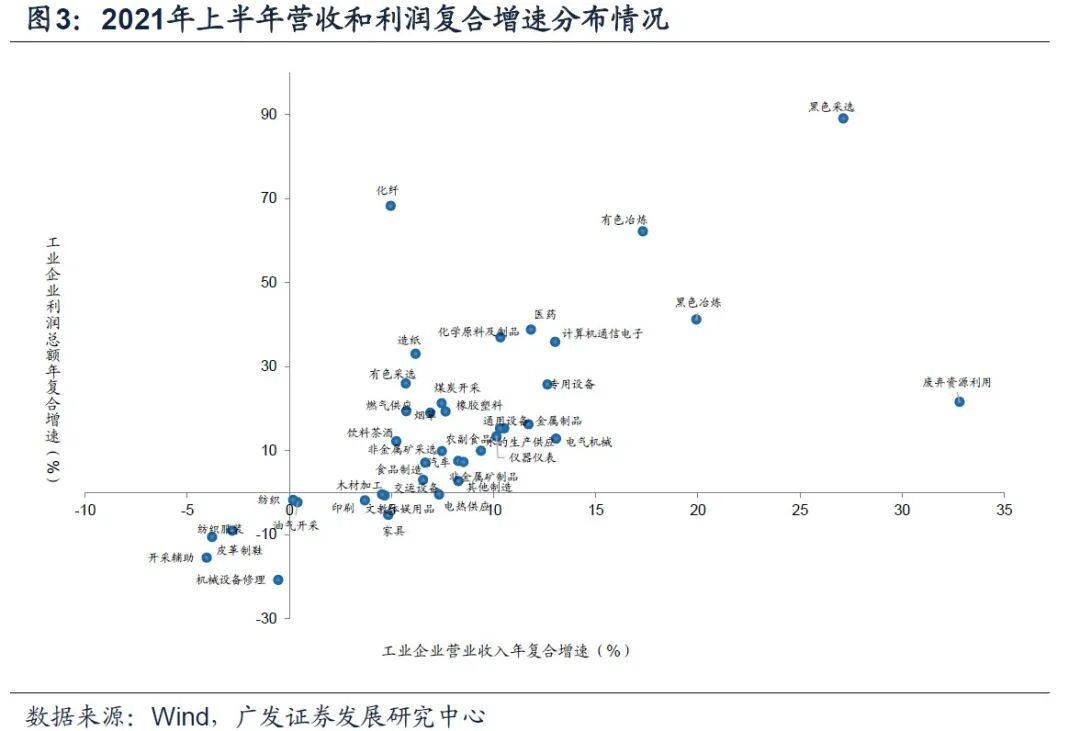 以2019年同期为基准,年复合增速靠前的行业包括黑色采选(89.1%)、化纤(68.3%)、有色冶炼(62.2%)、黑色冶炼(41.2%)、医药(38.8%)、化学原料及制品(37%)、计算机通信电子(35.9%)、造纸(33.1%)、有色采选(26%)、专用设备(25.7%)、废弃资源利用(21.6%)、煤炭开采(21.3%)。