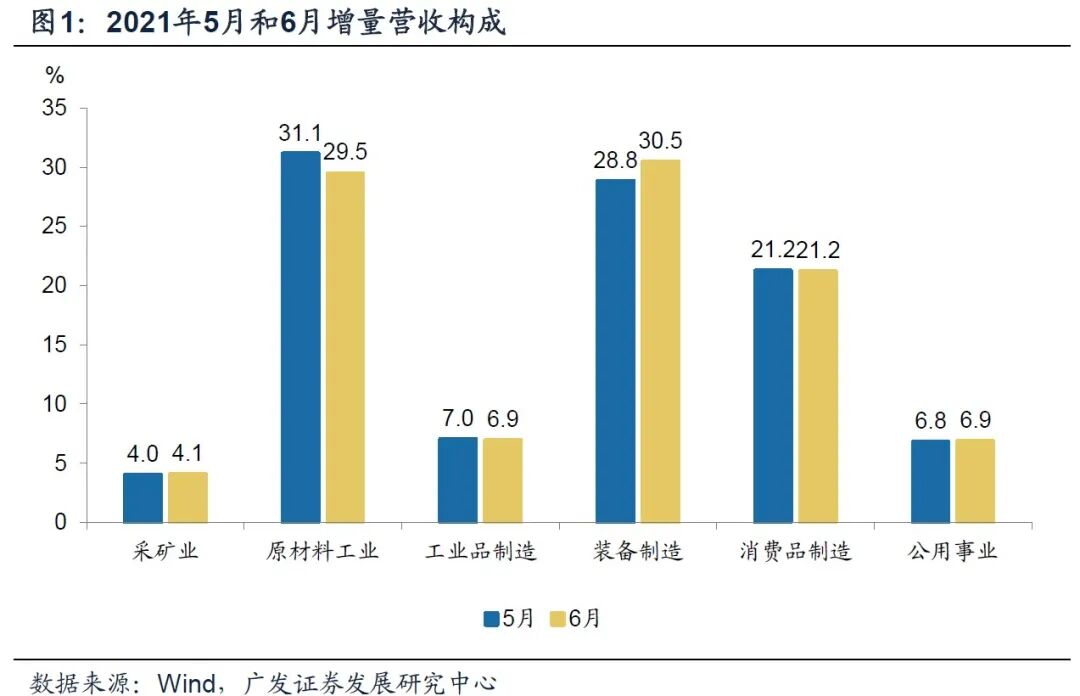 从营收的增量构成来看,6月采矿业占比4.1%(前值4.0%,下同)、原材料工业[1]占比29.5%(31.1%)、工业品制造[2]占比6.9%(7.0%)、装备制造业[3]占比30.5%(28.8%)、消费品制造业占比21.2%(21.2%)和公用事业占比6.9%(6.8%)。