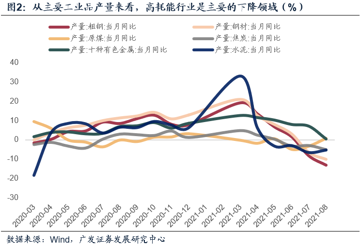 从主要工业品产量来看,高耗能行业是主要的下降领域,对应供给收缩幅度较大。粗钢、钢材均进入同比双位数负增长区间,原煤同比略高于上月但也只有0.8%,焦炭进一步下行至-5.0%,水泥在同比-5.2%的低位徘徊,有色产量增速降至零增长附近。从偏强的价格特征来看,这些产品需求端下行没那么快。供给端去产量、能耗双控应是主要背景。
