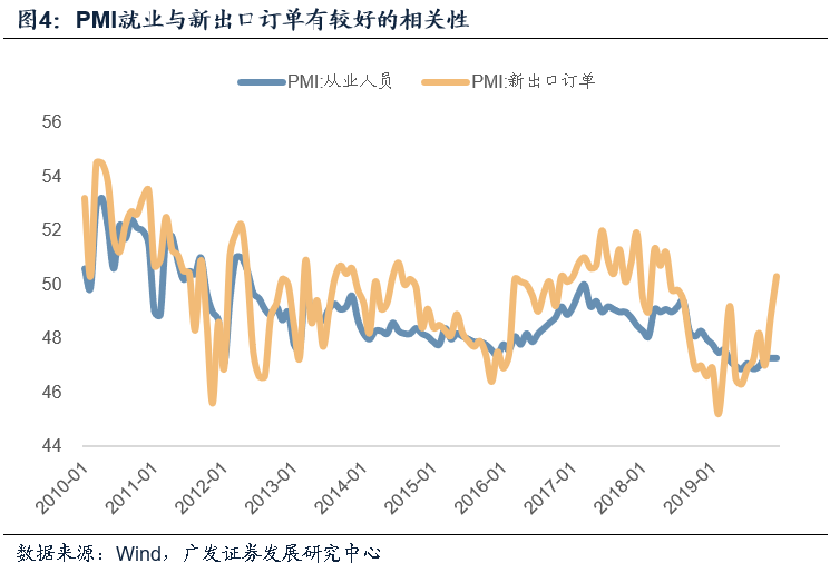 在2019年5月《如何看待当前的就业状况》中,我们指出:1)建筑业就业主要看建筑行业景气度,它与房地产施工、工程机械产销量等数据相关。2)服务业就业主要看服务行业景气度,但2017年以来这一部分就业弹性变弱,我们猜测和新经济业态替代、供给侧改革均有关系。3)制造业就业则主要看出口走势,城镇调查失业率(倒数)与出口增速,PMI就业与新出口订单均有较好的相关性。
