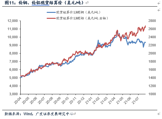 9月原油价格震荡上行,截至28日布油价格环比8月上涨7%。化工品价格大幅上行,CCPI指数环比大涨11.9%,其中工业硅、黄磷、烧碱等能耗双控品种涨幅靠前。有色金属涨跌互现。LME现货铜较8月末环比下跌2.0%;LME现货铝环比涨6.8%;LME锌、铅、锡、镍现货价环比分别录得2.5%、-9.5%、5.8%、-4.6%。贵金属表现相对弱势。