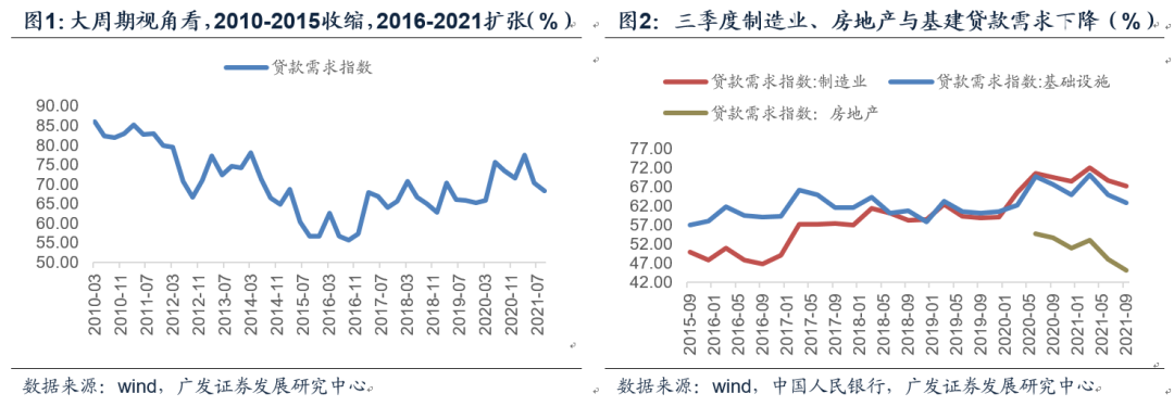 实体的贷款需求是微观经济的重要映射,“贷款需求指数”继二季度回落后,三季度继续回落2.2个点降至68.7,目前水平已与2019年上半年相仿。从大周期来看,这一指标自2016年Q3触底以来一直震荡上行,即2010-2015年整体属于贷款需求收缩期,2016-2021年整体属于贷款需求扩张期。简单来说,目前处于大周期扩张期中的小周期回落期。