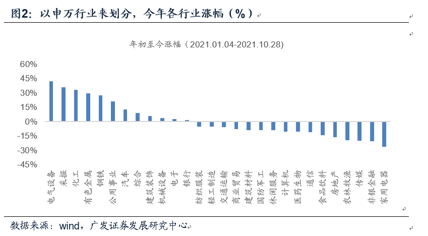 按申万一级行业分类来看,今年(截至10月28日)涨幅排名前列,对指数形成支撑的主要是电气设备(42%)、采掘(36%)、化工(33%)、有色金属(29%)、钢铁(27%)、公用事业(21%)六个行业。