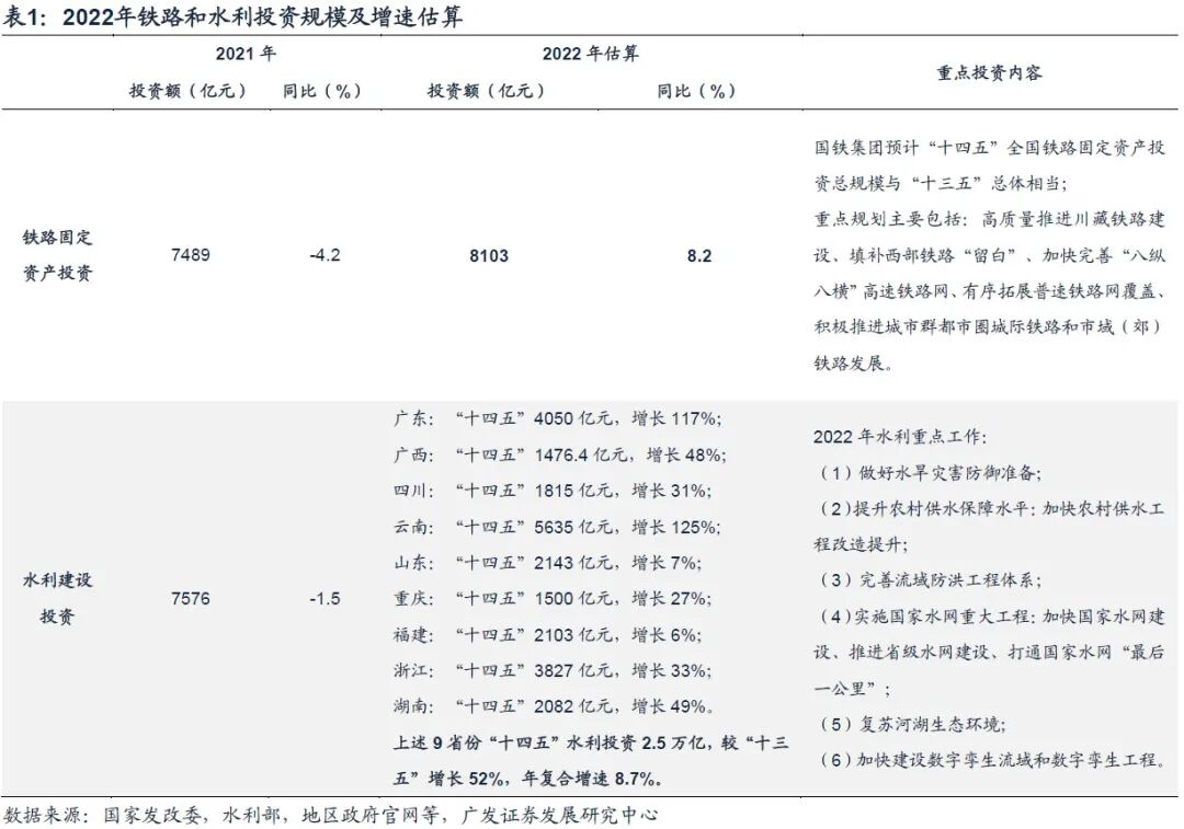 “十四五”重大项目传统基建主要任务集中在铁路和水利建设投资,预计2022年二者同比增速将分别达到7.0%和8.7%左右。