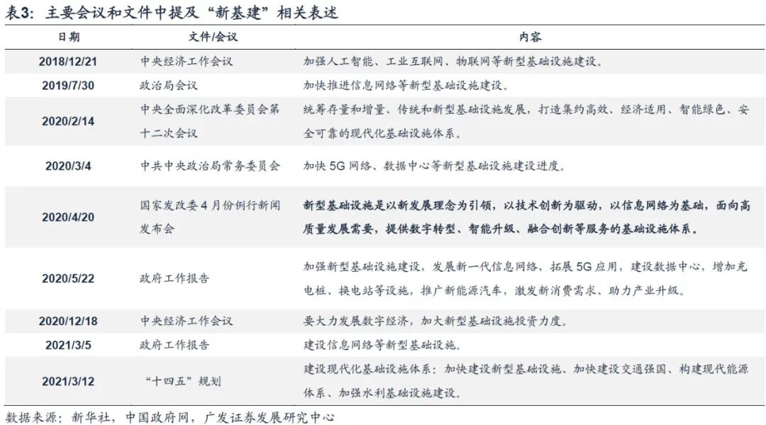 “十四五”规划对新基建的部署包括:5G网络建设、千兆光纤网络升级、中小城市基础网络完善工程、物联网、大数据中心、工业互联网等,以及交通、能源、农业水利、市政等传统基础设施的数字化改造。