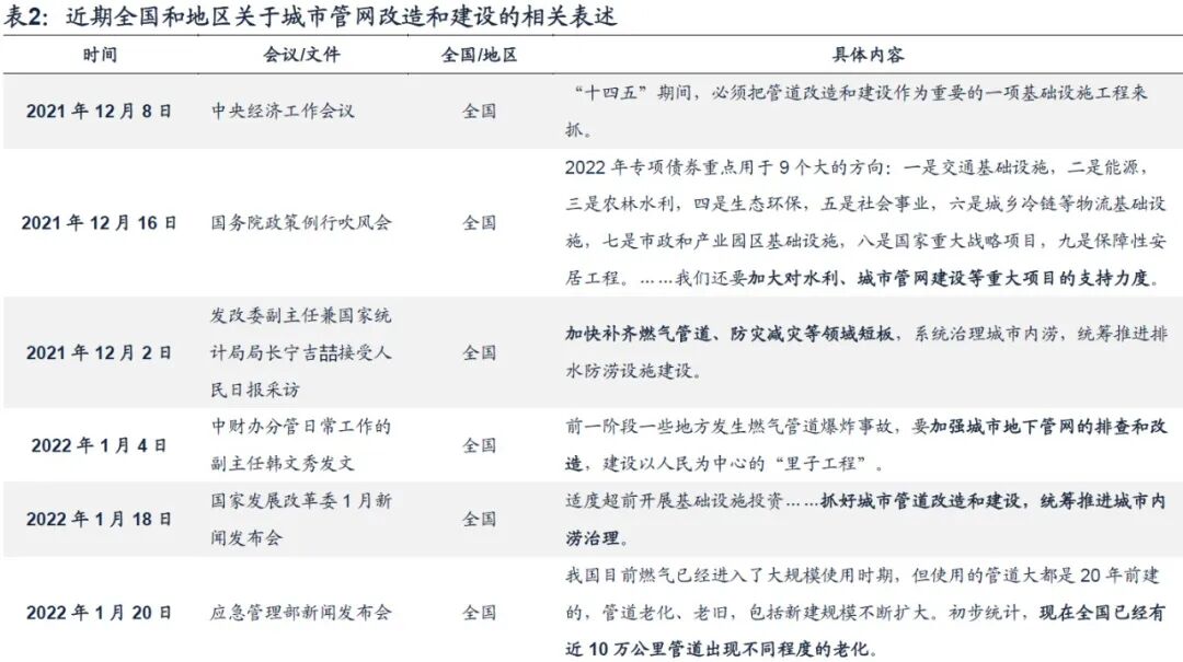根据人民日报报道,2021年12月8日中央经济工作会议上提到,“最近发生的安全事故,多和年头久了管道陈旧失修有关。并要求‘十四五’期间,必须把管道改造和建设作为重要的一项基础设施工程来抓”。