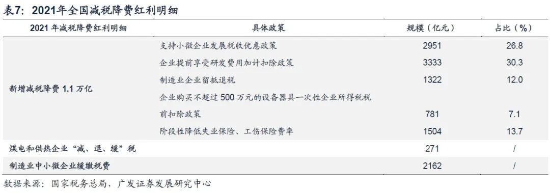 1.2021年税费优惠可以总结为“减税降费+缓税缓费”,其中减税降费新增1.1万亿;制造业中小微企业缓缴税费2162亿元,煤电和供热企业“减、退、缓”税271亿元。