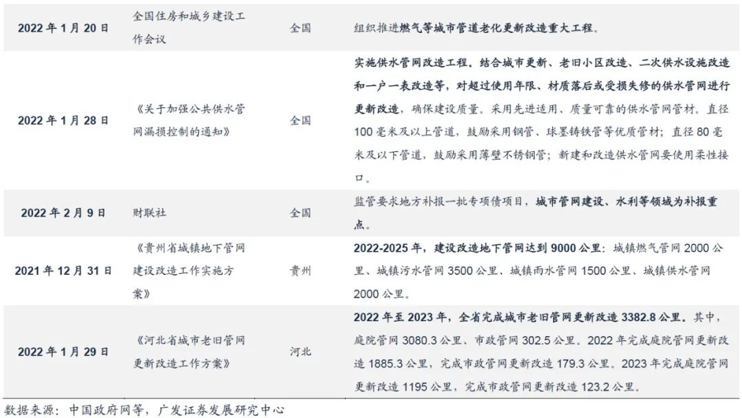 政策方向一:基础设施建设的基本盘在传统基建。传统基建一则要依靠重点区域,比如雄安、成渝2022年投资均有加快;二则要靠重大项目,“十四五”规划102项重大工程项目是传统基建的主要抓手,这些项目集中在交通、水利、环保、新型城镇化,以及民生类、安全类基础设施。三是要靠关键领域。铁路投资2021年同比下降4.2%;按照国铁集团预计“十四五”全国铁路投资规模与“十三五”相当的标准,则后续四年平均每年铁路投资额需要8100亿元左右,对应2022年铁路投资年度增速为8.2%;水利投资在2021年的负增长也与整体固定资产投资的低增环境有一定关系。根据广东等共9个省份“十四五”期间水利投资额目标,年复合增速为8.7%;城市管道改造和建设尤其是老旧燃气管道更新改造则是城市基建的重点,中央经济工作会议之后被发改委、住建部和应急管理部列入2022年重点工作部署中。根据应急管理部统计,我国目前老化燃气管道10万公里,占2020年底燃气管道总长度85万公里的12%。