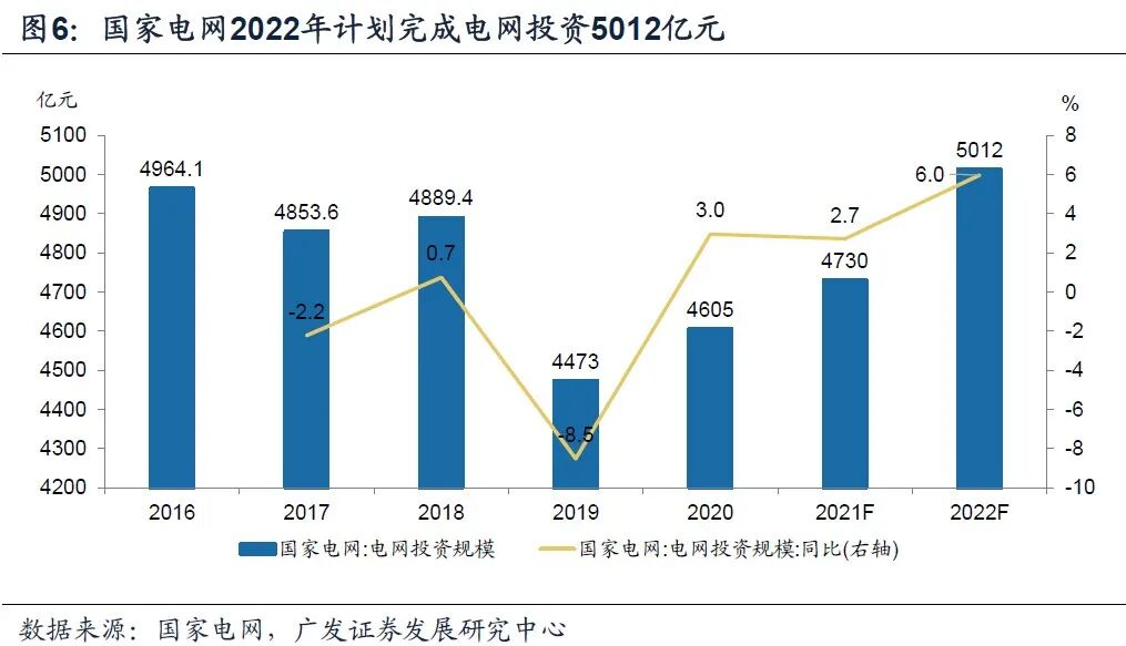 2022年国家电网计划完成电网投资5012亿元[33],相较于2021年计划的4730亿元[34]增长6%,2017-2021年增速分别为-2.2%、0.7%、-8.5%、3.0%、2.7%[35]。特高压和智能电网建设作为电网投资的重点任务,意味着二者在2022年增速回升且应该明显高于整体6%的增长。