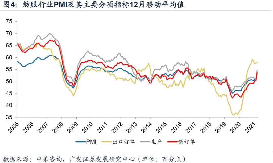 纺服行业2月份PMI达到74.2,环比回升24个百分点;新订单和生产双双反弹至80以上。在纺服行业景气度改善的背后有季节性因素的驱动,春节相近的2014年和2019年2月份纺服行业PMI环比分别回升9.3和11.3个百分点。2月份超季节性的景气度改善能否持续需要进一步跟踪观测(图4)。