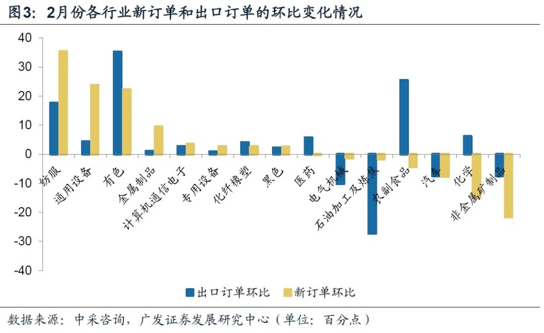 从需求端看:(1)内需改善显著的行业包括通用设备、纺服、金属制品和专用设备;(2)出口订单环比改善显著的行业包括有色、农副食品、纺服、化学等;结合总体景气度的分布,显然内需订单是影响2月份行业景气度变化的核心变量。