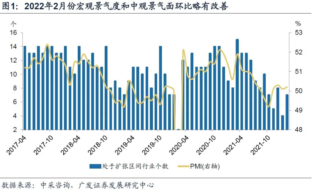 第一,从PMI行业景气度看,2021年四个季度扩张行业个数算术平均值分别为10.7个、12.7个、9个和6.7个;2022年1月下降为4个,2月重新上升至7个。这一数字显示经济边际上已有好转;但绝对景气度仍偏低。