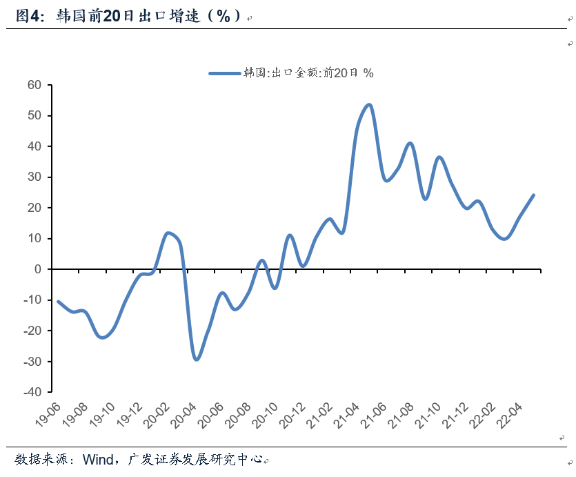 5月前20日韩国出口金额386亿美元,同比增速录得24.1%。今年1-4月韩国全月出口增速15.5%、20.8%、18.8%、12.9%,去年全年出口增速为25.7%。截止5月第四周,中国出口集装箱运价指数CCFI录得3191,同比增速39.0%,低于4月末读数55.5%。