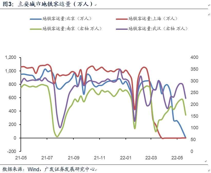 5月深圳地铁客运量回升,至最后一周均值同比降幅已收窄至5%以内,反映“常态化核酸+正常复工复产”模式下经济的初步修复。广州地铁客运量均值环比4月回升14.8%。不过在疫情影响下,5月北京地铁客运量均值环比跌幅扩大至72.3%,6月北京、上海地铁客运情况将是下一步的重点观测指标。5月电影票房月均值环比4月有所回升,但同比跌幅有所加大。