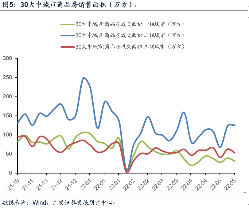 截至5月29日,全国30大中城市商品房成交日均面积录得28.4万方,其中前四周分别录得19、31、32、33万方,第二周以来销售数据边际好转。月均值环比相较4月27.5万方回升3.2%,近十年来5月环比增速录得-10%-28%(近十年环比均值1.5%);相较于历史同期数据仍弱(同比增速-51%)。本月一二三线成交面积仍属弱势,5月前29日一、二、三线城市成交面积同比增速为-50%、-49%、-55%。土地成交溢价率延续低迷,前四周读数分别录得1.1%、2.8%、2.2%、1.5%。