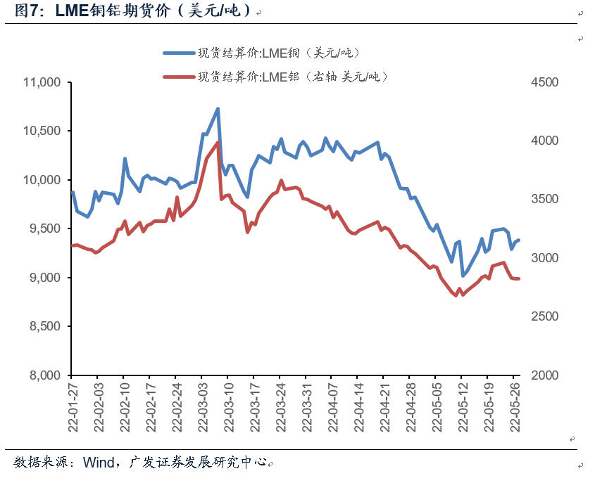 截至5月27日,LME现货铜收于9383美元/吨,较上月末环比回落4.5%。LME现货铝收于2823美元/吨,环比录回落7.1%,国内疫情仍制约需求回暖,下游有色企业开工率普遍不及预期。其余有色金属多数收跌,LME锌、铅、锡、镍现货价环比读数分别录得-9.4%、-8.2%、-16.5%、-14.1%。美联储紧缩预期发酵,Comex金、银期货价分别录1851美元/盎司和22.1美元/盎司,环比回落3.2%和4.3%。此外全球主要农产品价格多数强势,截止5月27日,CBOT小麦、玉米、大豆最新期货价分别录得1157、9.7、776.3美分/蒲式耳,环比上月末分别录得9.7%、-4.6%、2.8%。