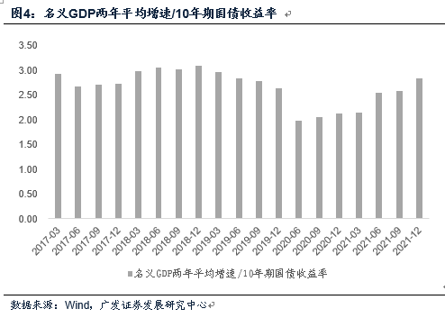 中期名义GDP的趋势增速同样是中期资产定价的核心变量。2012-2021年的十年中,中国名义GDP年均复合增长率为8.9%,而同期WIND全A年均复合收益率为10.8%;以2005年股权分置改革算起,2005-2021年名义GDP年均复合增长率为12.2%,WIND全A年均复合增长率为12.7%,即市场是基本有效的,经济的名义增长率大致是权益资产回报率的参照。对于债券来说也一样,过去五年名义GDP两年平均增速/10年期国债收益率的均值为2.7倍,这一估值意味着如果未来名义GDP中枢是9.0%,则10年期国债收益率理论合理中枢为3.3%;如果未来名义GDP中枢是7.3%,则10年期国债收益率理论合理中枢是2.7%;如果未来名义GDP中枢是类似2020-2021两年平均的7.7%,则10年期国债收益率的理论合理中枢是2.85%。