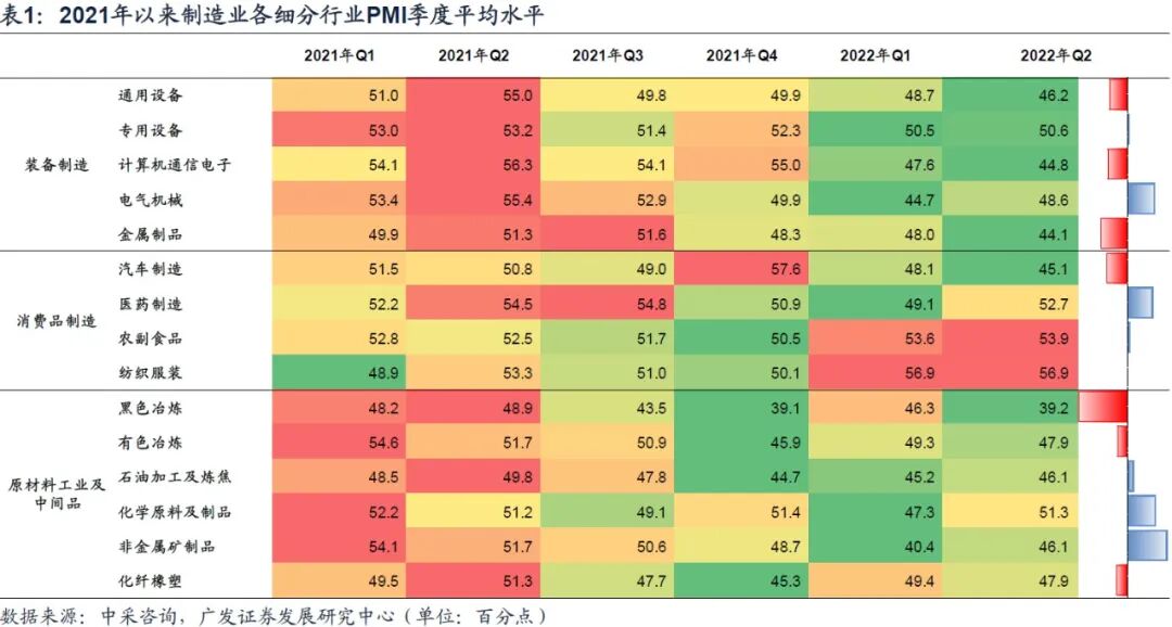 从量、价两个维度进一步理解上述利润增长格局,线索一利润高增长主要源于量的高景气度,线索二行业利润高增长更多来自涨价弹性的支撑。以PMI在上半年的平均水平来衡量,制造业内部细分行业景气度呈现下游消费品>原材料工业及中间品>中游装备制造的分化特征,尤其是纺服、农副食品平均景气水平遥遥领先,分别达到56.9和53.8。