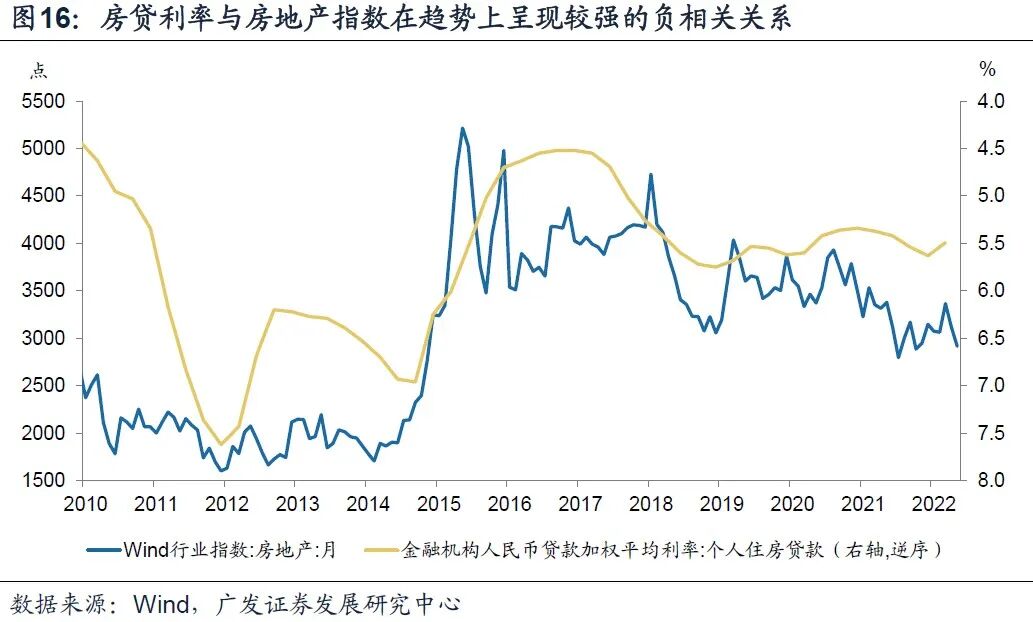 数据历史经验显示,购房成本(个人住房贷款利率)与房地产指数存在明显的负相关关系。