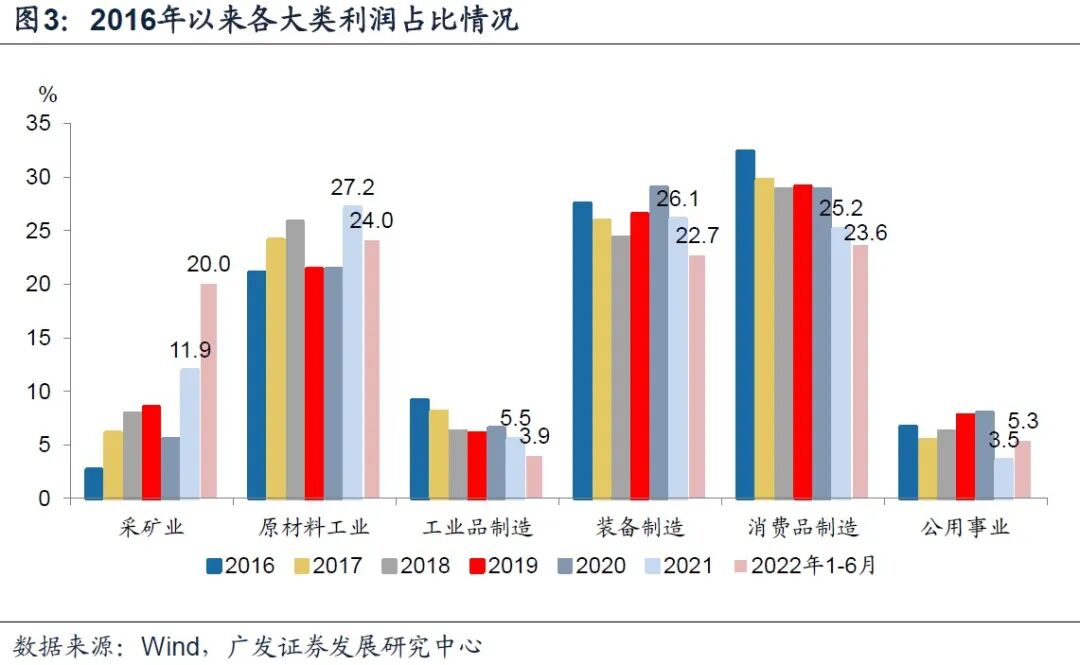 1-6月采矿业、原材料工业、中间品、装备制造、消费品制造、公用事业利润占比分别为20.0%、24.0%、3.9%、22.7%、23.6%、5.3%,采矿业和公用事业利润占比较2021年回升8.1和1.8个点,原材料工业、中间品、装备制造、消费品制造利润占比分别较2021年回落3.2、1.6、3.4和1.6个点。