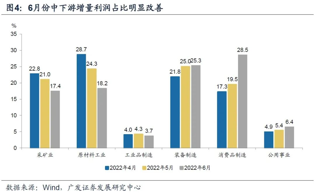 从边际利润占比趋势上,我们也能看出由上游向中下游转移的痕迹。以6月增量利润占比来看,装备制造、消费品制造、消费品制造(不含汽车)、公用事业占比分别较5月上升0.3、9.0、6.4和1.0个点。而采掘业、原材料工业和中间品制造增量利润占比则分别较5月下降了3.6、6.1和0.6个点。