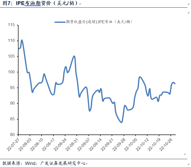 Wind数据显示:截至10月28日,IPE布油期货价(期末值,下同)录得96.3美元/桶。10月油价整体偏强,尤其是国庆假期全球大宗商品超跌反弹,主因在于OPEC+宣布今年11月减产200万桶/日;此外10月下半旬美联储加息预期初步缓和,美元震荡下行提振市场偏好,油价再度震荡回升。10月化工品价格指数CCPI录得4931点,环比9月末回落4.2%,其中跌幅靠前的品种主要为乙二醇、PVC。首先成本端原油价格震荡偏强,但终端纺服面料订单持续偏弱,聚酯工厂面临成本与库存上行压力,10月PTA期货价环比9月末录得-10.9%。PVC下游管材、型材需求随地产表现仍偏弱势,叠加检修压力影响市场交投情绪,PVC期货价环比9月末下跌8.5%。天然橡胶期货价录得11030元/吨,环比9月末回落8.1%,10月钢胎开工数据逐周回落,供给端海南区域减产炒作较多,但需求端持续偏弱制约价格表现。