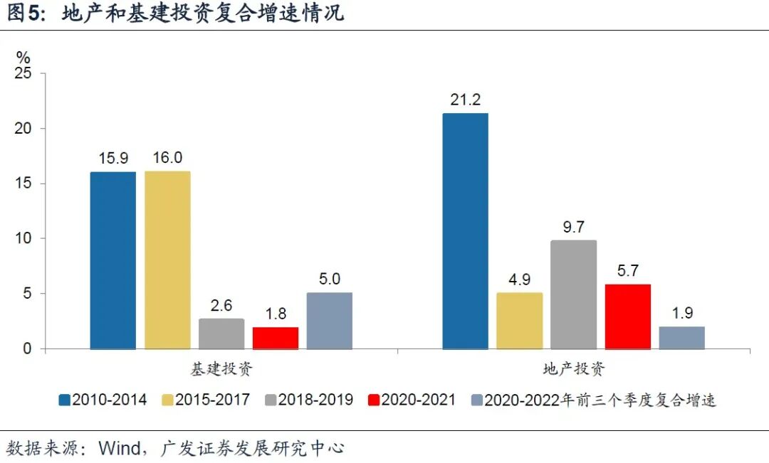 地产投资名义增速方面,2010-2014、2015-2017、2018-2019、2020-2021、2020-2022年前三季度复合增速分别为21.2%、4.9%、9.7%、5.7%、1.9%。由于本轮地产投资的显著下行开始于2021年二季度,以2020-2022年前三季度计算,复合增速1.9%,不仅显著低于2018-2019年的9.7%,也低于2015-2017年4.9%的增速水平。