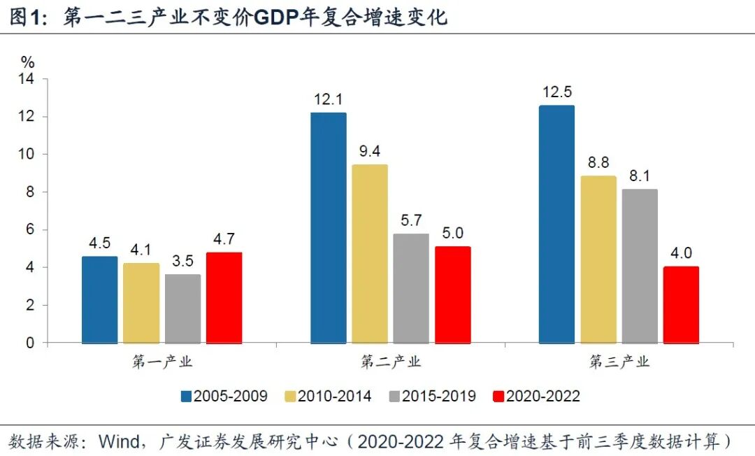 第二产业,2010-2014、2015-2019年两个时间区间内年复合增速分别为9.4%、5.7%,十年年均复合增速为7.5%;2020-2022年实际复合增速为5.0%。