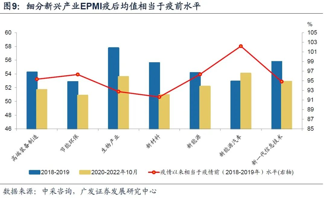 计算2020年至2022年10月各细分战略性新兴产业EPMI平均水平,新能源汽车、生物产业、新一代信息技术、新能源产业平均景气领先,分别为54.1、53.6、52.9与52.2,高端装备制造、节能环保与新材料景气均值分别为51.7、50.9和50.9。